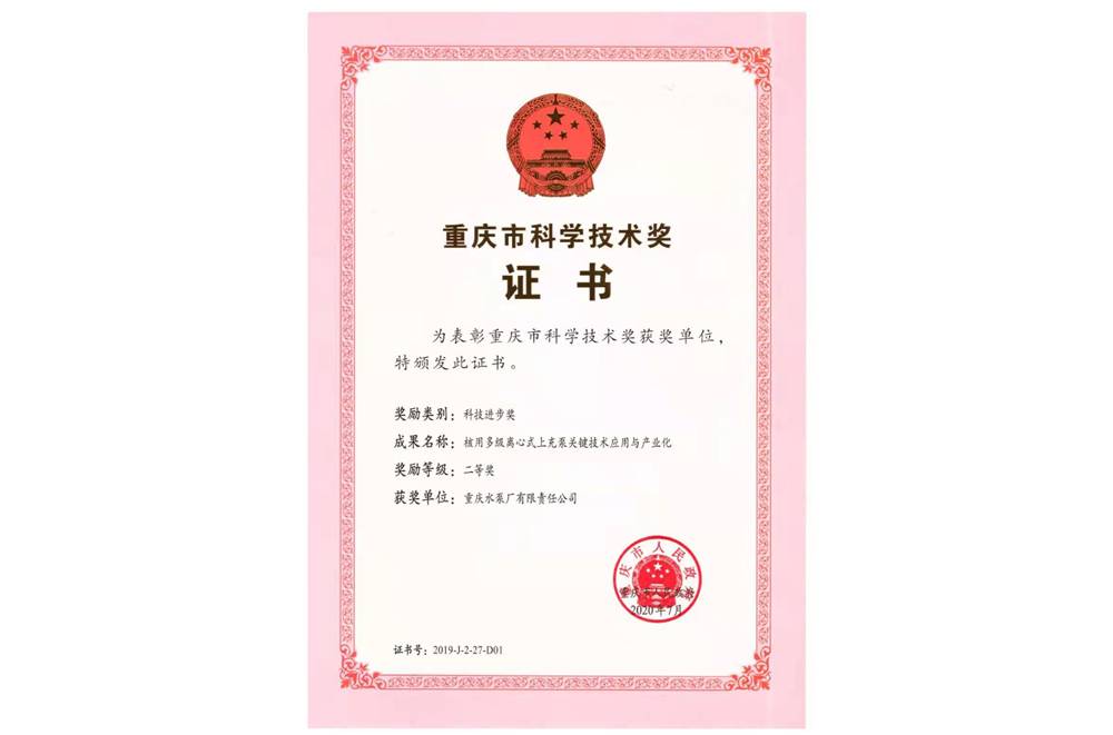 重慶市科技進步二等獎(核用多級離心式上充泵關鍵技術應用與產業化)