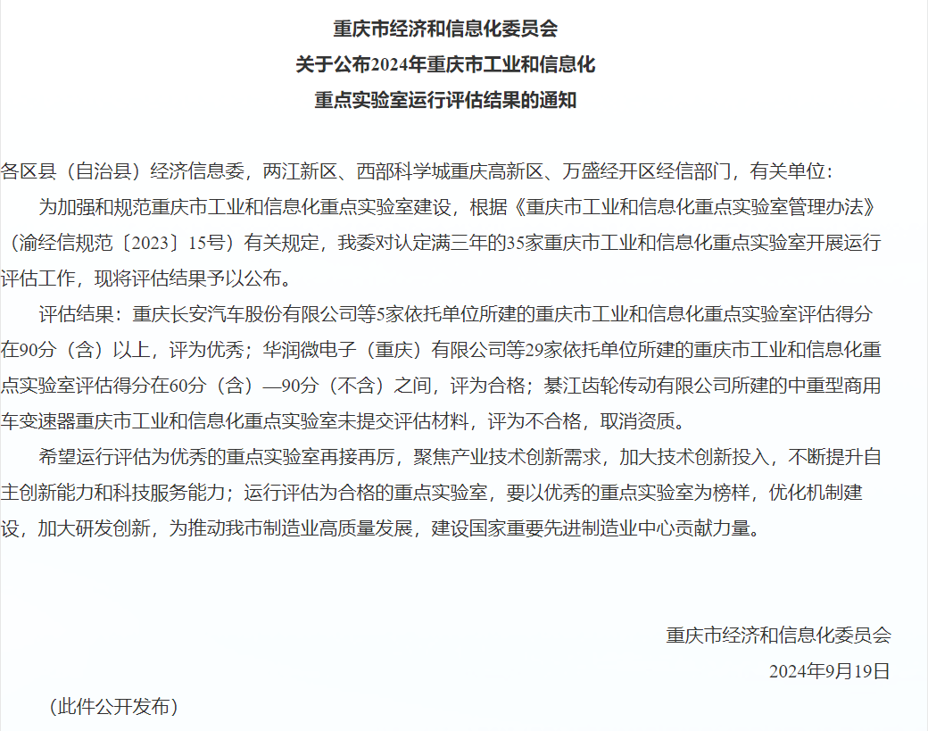 近日,重慶市經濟和信息化委員會公布了2024年度重慶市工業和信息化重點實驗室評估結果,重泵公司“高參數特種工業泵實驗室重慶市工業和信息化重點實驗室”以被評為“優秀”,在全市35個工業和信息化重點實驗室中排名第四。