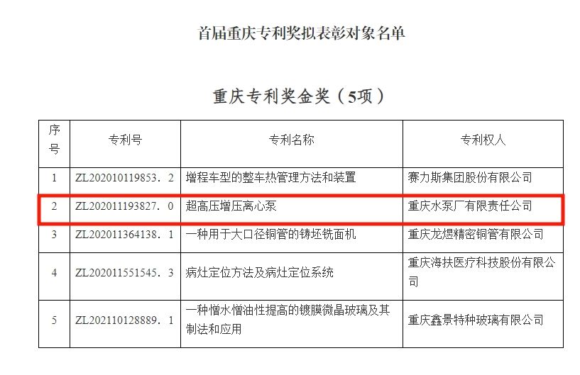 近日,重慶市人力資源和社會保障局、重慶市知識產(chǎn)權(quán)局下發(fā)《關(guān)于重慶市知識產(chǎn)權(quán)保護(hù)和應(yīng)用貢獻(xiàn)獎擬表彰對象的公示》,重泵公司申報的《超高壓增壓離心泵》(中國發(fā)明專利,專利號ZL202011193827.0)獲評首屆重慶專利獎金獎。
