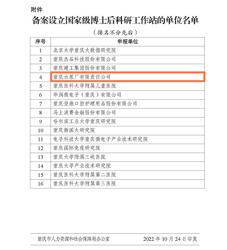 10月24日,重慶市人力資源和社會保障局辦公室印發《關于在北京大學重慶大數據研究院等16 個單位設立國家級博士后科研工作站的通知》(渝人社辦〔2022〕304號),根據全國博士后管委會辦公室《關于2022 年第一批次博士后科研工作站新設站備案情況的函》(博管辦〔2022〕108 號),重泵公司獲批設立國家級博士后科研工作站。